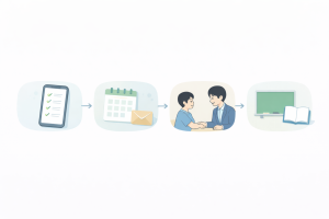 前項まででおすすめの塾を紹介してきましたが、塾講師として働くのが初めての場合は、応募から勤務開始までの流れにも不安を感じる方が多いと思います。そこで本章では、STEP1〜5に分けて、候補選び → Web求人から応募 → 面接 → 採用連絡 → 初出勤までの流れを分かりやすく解説します。